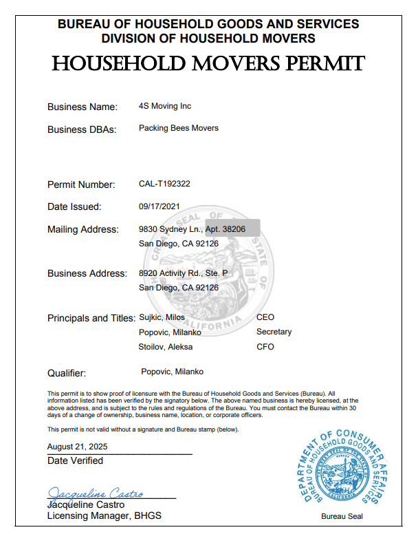 Licensing and Services: Fully licensed and insured in California, specializing in various packing services for moving, remodeling, emergencies, and more.